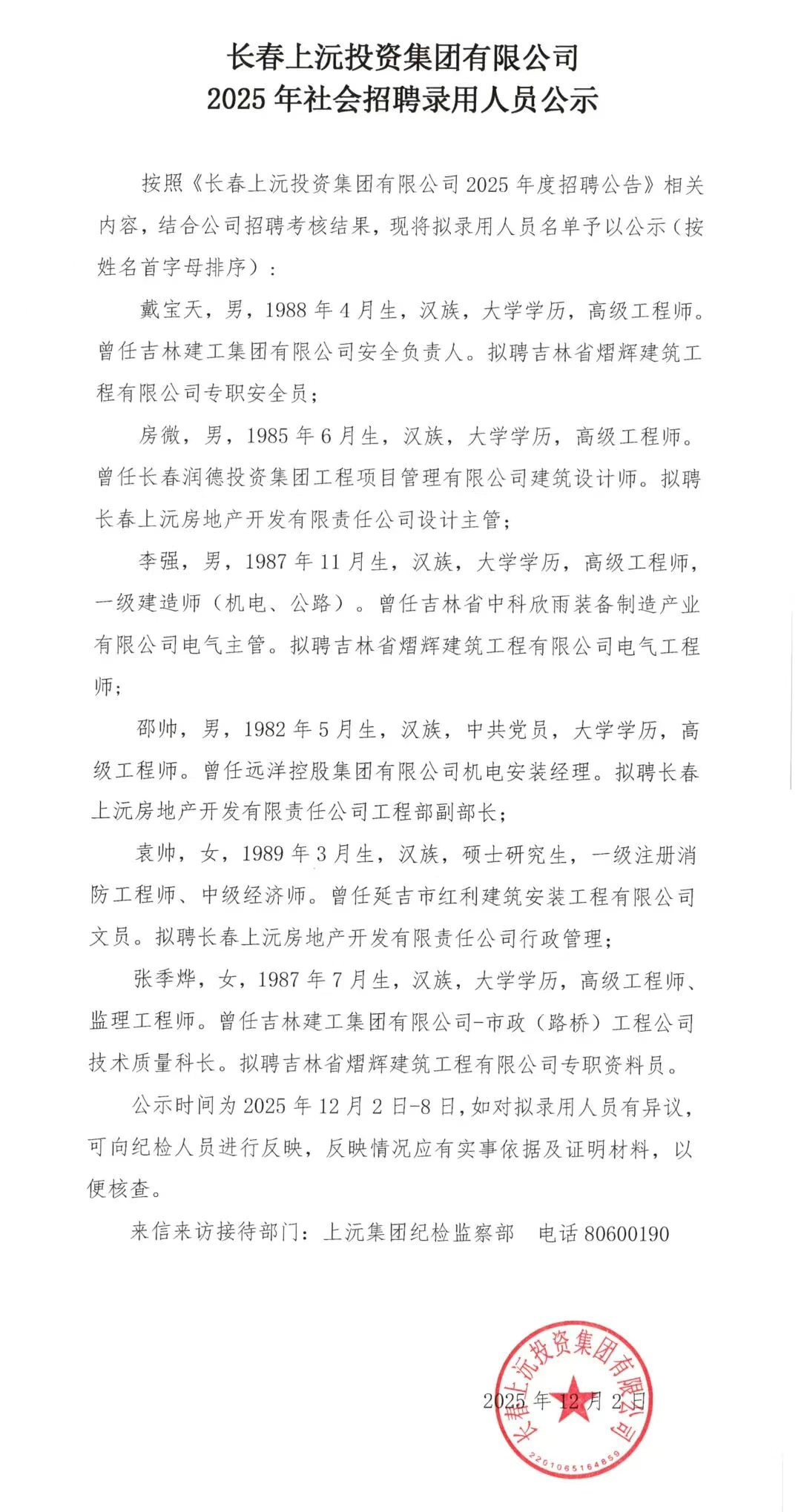 长春上沅投资集团有限公司2025年社会招聘录用人员公示