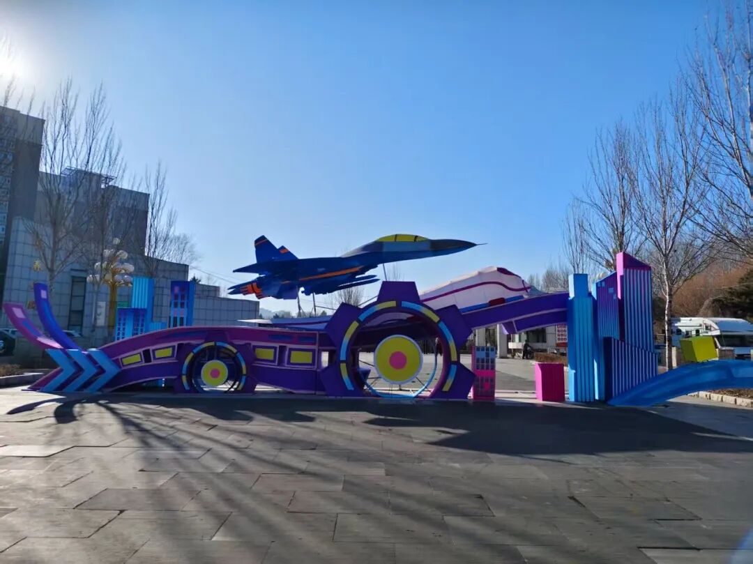 北门“逐梦蓝天”主题亮化以澄澈“航空蓝”为主调,既呼应冬日冰雪的纯净质感,更象征航空科技的前沿锋芒。流线型灯组模拟航空器翱翔轨迹,市民漫步其中,感知产业发展的强劲脉搏。
