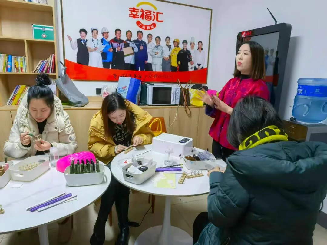 培训结合当下市场就业需求,主打“实用、易上手、门槛低”的特点,邀请经验丰富的美甲老师授课。课堂上,老师系统讲解穿戴甲的种类、工具使用、甲片测量修剪、胶水粘贴技巧及日常维护等全套流程。“理论讲解+分步示范+手把手实操指导”的方式,让学员快速掌握技能。学员们认真聆听、积极实践,操作手法从生疏逐渐变得熟练,现场学习氛围十分浓厚。