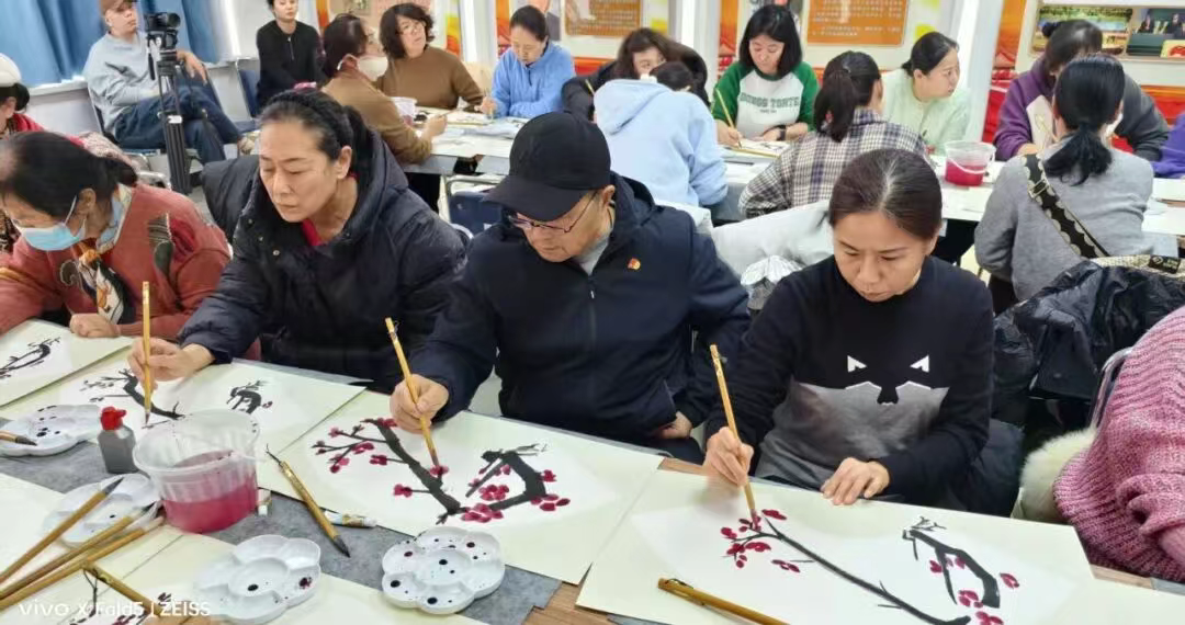 活动邀请吉林省美术馆青年国画家张庆老师主讲指导。活动伊始,老师梳理中国画历史源流与艺术特点,解读“笔墨情趣”“诗书画印”的独特内涵。随后细致演示梅花画法,拆解用笔、用墨及构图技巧。体验创作环节,居民踊跃参与临摹创作,老师一对一指导,纠正用笔姿势、讲解水墨变化。