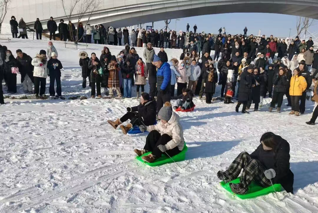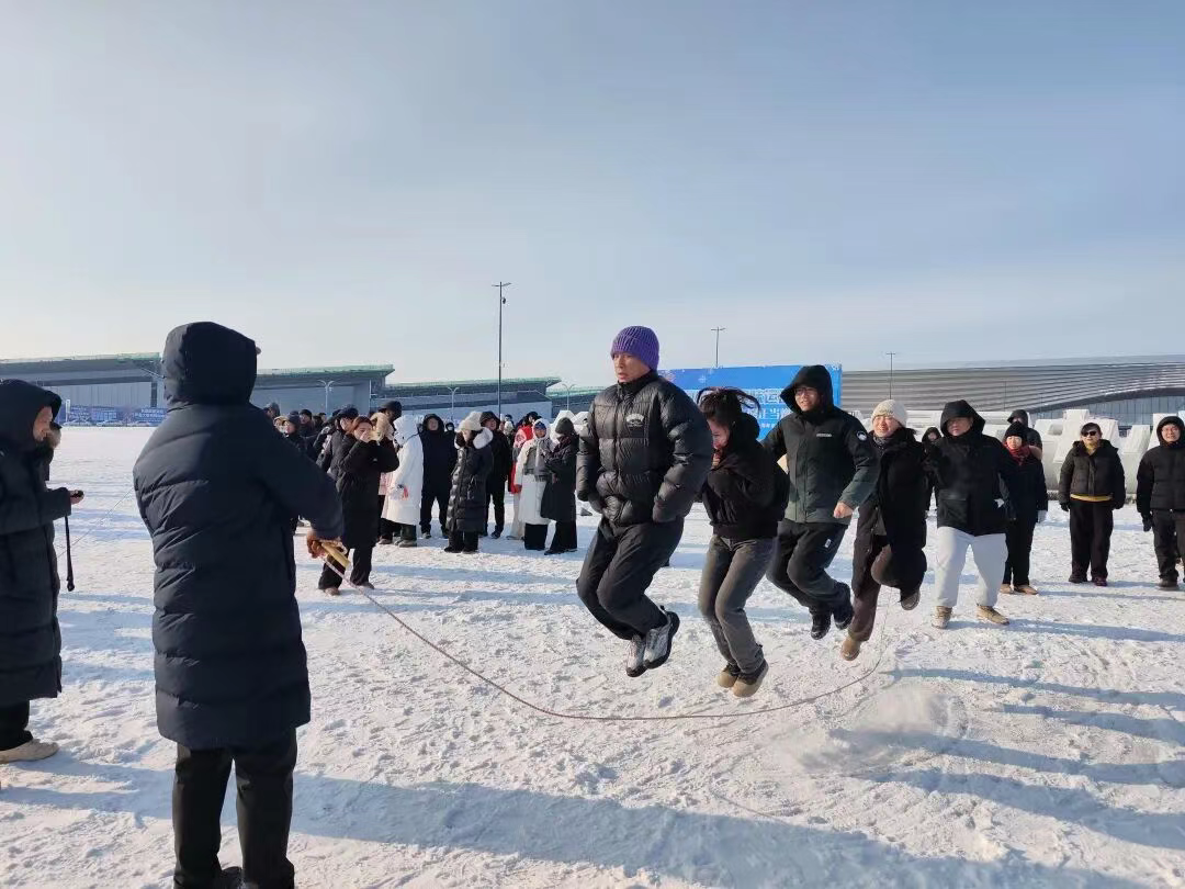 本次运动会在两大场地同步进行,冰车竞速、雪地拉爬犁项目于天空之眼下方水域段开赛,雪地毛毛虫竞速、混合跳大绳、雪地拔河在航展中心南广场浮雕字前方比拼。赛场上,男子冰车竞速选手俯身弓背、飞驰冰面,女子组选手不甘示弱,展现出飒爽英姿;雪地拉爬犁项目中,队员们喊着整齐口号,步调一致向终点冲刺;雪地毛毛虫、混合跳大绳考验团队协作,大家默契配合、奋勇争先;雪地拔河赛场高潮迭起,双方队员紧握长绳、铆足力气,啦啦队的呐喊助威声此起彼伏,将现场氛围推向顶点。